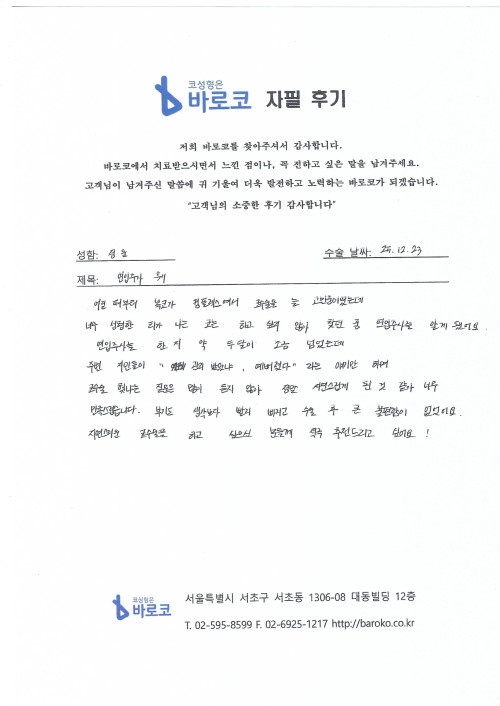 얘기만 하며 코수술 했냐는 질문을 많이 듣지 않아 정말 자연스럽게 된 것 같아 너무 만족스럽습니다.
