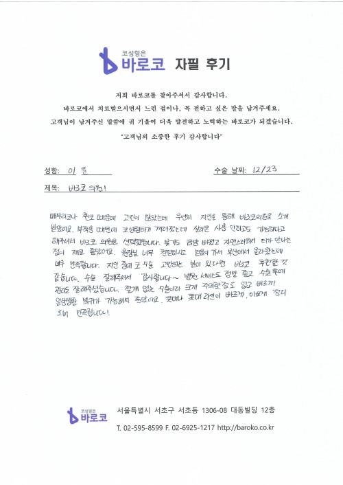 바로코의원을 소개 받았어요 부작용 때문에 코성형하기 꺼려졌는데실리콘 사용 안하고도 가능하다고 해주셔서 바로코의원을 선택했습니다.붓기도 금방 빠졌고 자연스러워서 티가 안나는 점이 제일 좋았어요원장님 너무 친절하시고 믿음이 가서 부산에서 올라왔는데 매우 만족합니다.지인 중에서 코수술 고민하는 분이 있다면 바로코 추천할 것 같습니다.