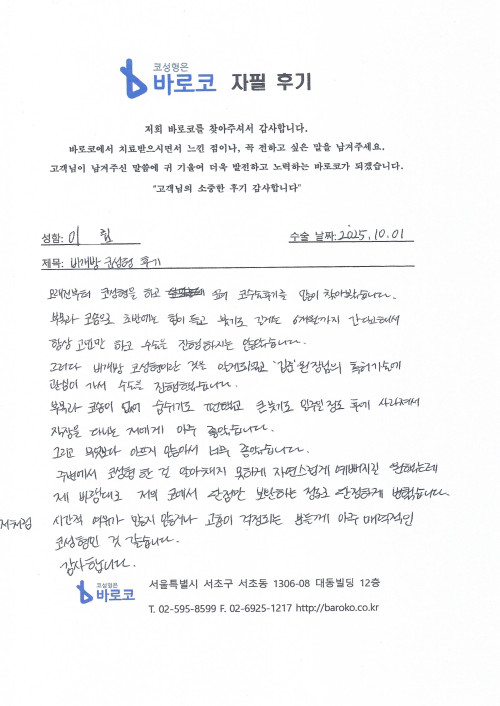 주변에서 코성형한 걸 알아채지 못하게 자연스럽게 예뻐지길 원했는데 제 바램대로 저의 코에서 단점만 보완하는 정도로 단정하게 변했습니다.